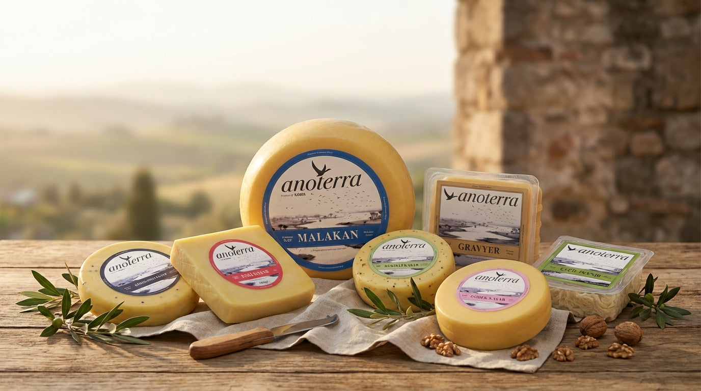 Anoterra, geleneksel peynircilik mirasını modern damak tadına taşırken, Anadolu'nun en seçkin peynir çeşitlerini sunmaktadır. Kars'ın zengin aromasıyla ünlü eski kaşarı, olgunlaştırılmış dokusuyla benzersiz bir lezzet sunar. Yine Kars'tan gelen ve özel olgunlaşma süreçleriyle tanınan gravyer peyniri, delikli yapısı ve aromatik tadıyla fark yaratır. Hellim peyniri ise Kıbrıs'ın geleneksel lezzetlerinden ilham alarak üretilir ve özellikle kızartıldığında eşsiz bir kıvam ve tat sunar. Anoterra, bu peynirlerle sınırlı kalmayan çeşitleriyle en doğal ve taze halinde sofranıza gelir.